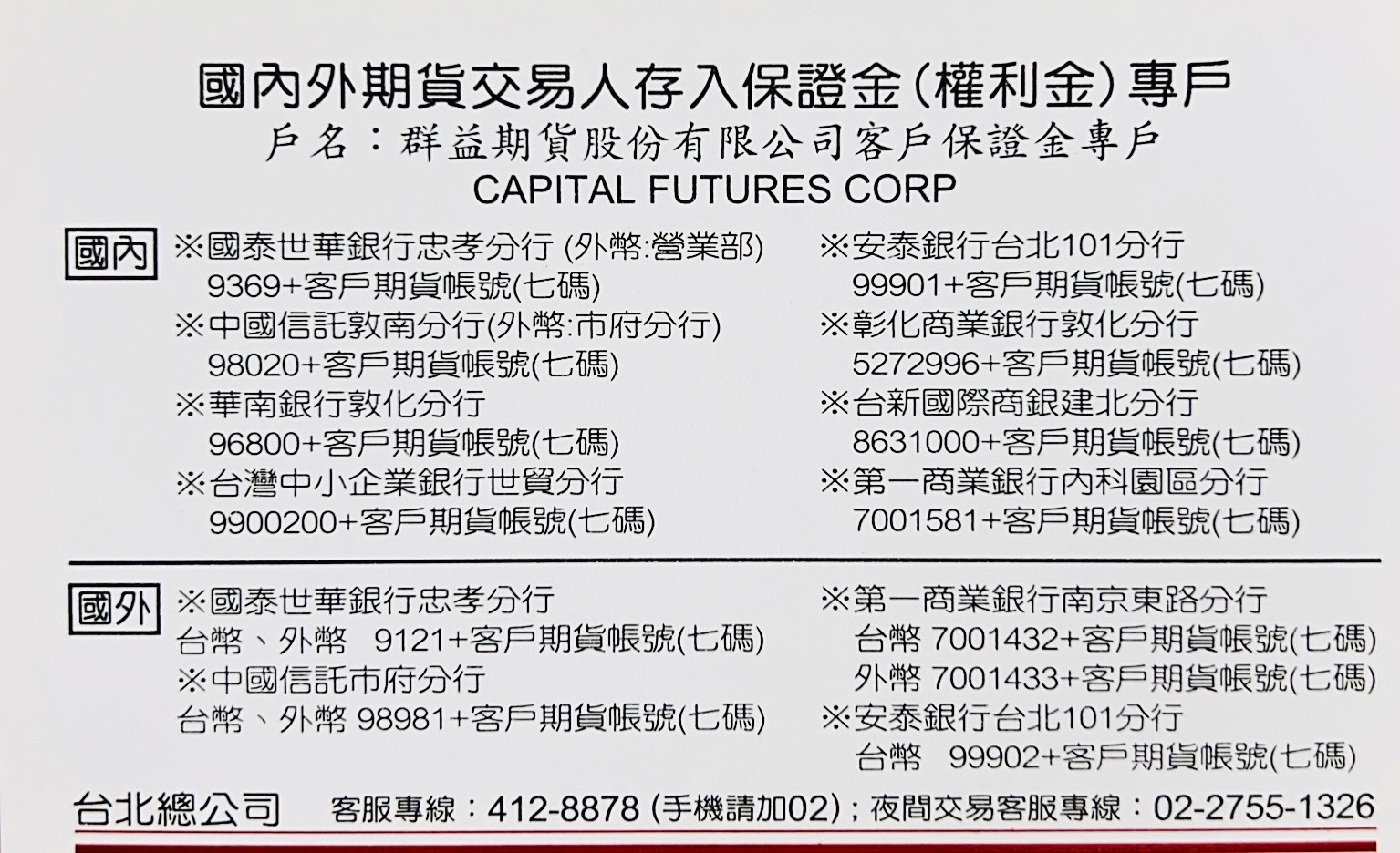 - 轉帳時,格式為「各銀行+期貨帳號7碼」,譬如轉帳國泰→就是9369+1234567。