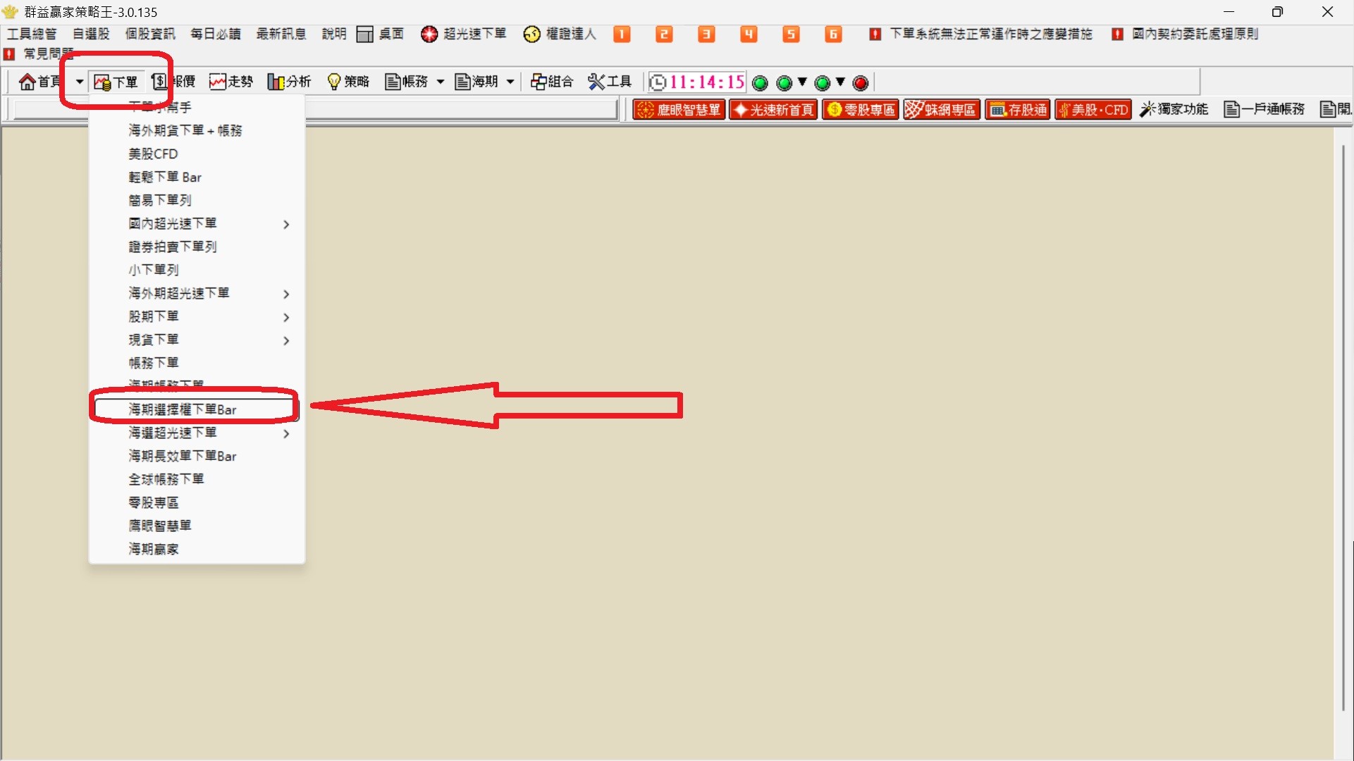 Step1: 開啟策略王 → 下單→ 海期選擇權下單Bar