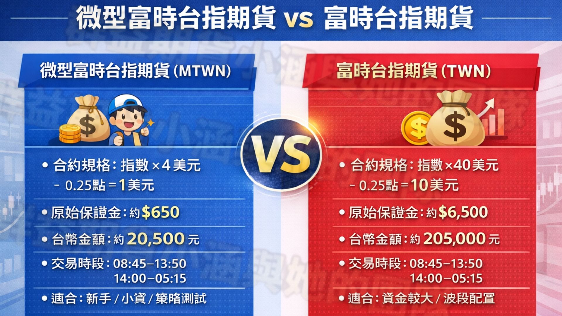 微型富台 = 標準富時台指(TWN)的 1/10 規模。 這讓你可以用更小的單位做「分批、加碼、減碼」,對新手風控很友善。